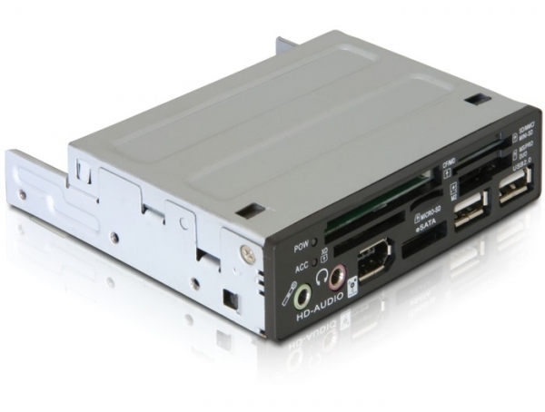 This Delock card reader can be installed into the 3.5”drive bay of your PC. Besides its classic function it offers you two USB 2.0 ports, a FireWire port, an eSATA port as well as HD-Audio input and output.