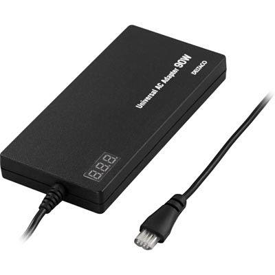 Deltaco SMP-90WDS. Input voltage: 100-240, Input frequency: 50/60, Output power: 90 W. Power supply type: Indoor, Purpose: Notebook, Power current type: AC-to-DC. Colour of product: Black, Cable length: 1.5 m, Housing material: Plastic. Width: 67 mm, Depth: 143 mm, Height: 16 mm. Cables included: AC