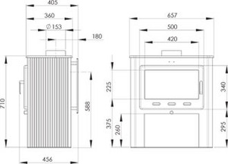 Deville Aka 2. Case design: Freestanding, Colour of product: Black. Fuel type: Firewood, Suitable for rooms up to: 280 m³, Efficiency: 72.1%. Power: 8000 W. Width: 657 mm, Depth: 405 mm, Height: 710 mm