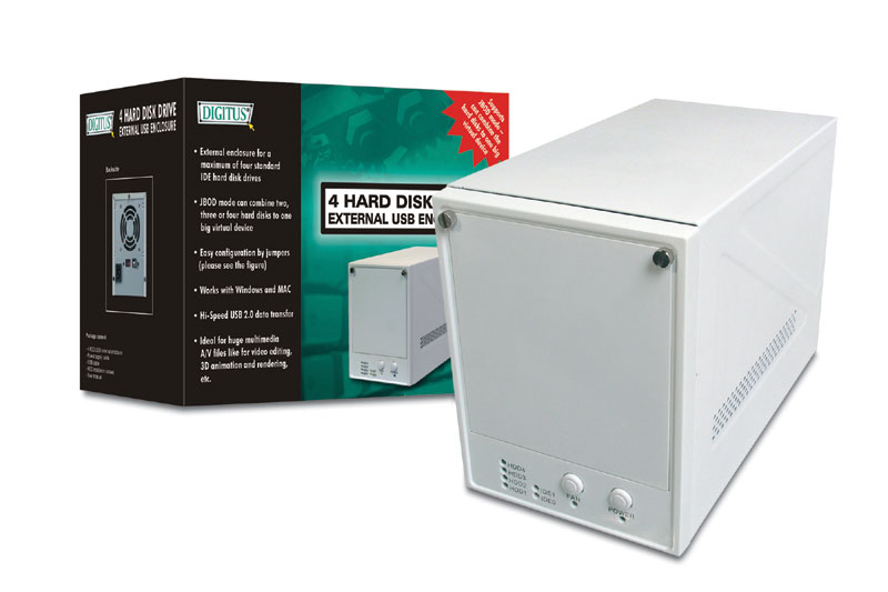 4x HDD Box with JBOD (Just A Bunch Of Disk) mode: Combining multiple physical disk drives into a single virtual one. 2 to 4 disks can be merely concatenated, end to beginning, so they appear to be a single large disk. Used to turn several odd-sized drives into one useful drive. For example JBOD could use a 300GB, 500GB, 400GB and 200GB drive to combine into a logical drive at 1.4TB (max. up to 2TB), which is often more useful than the individual drives separately.