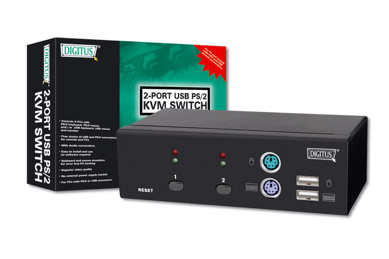 - Controls two PCs with one PS/2- or USB-keyboard, one PS/2- or USB-mouse and