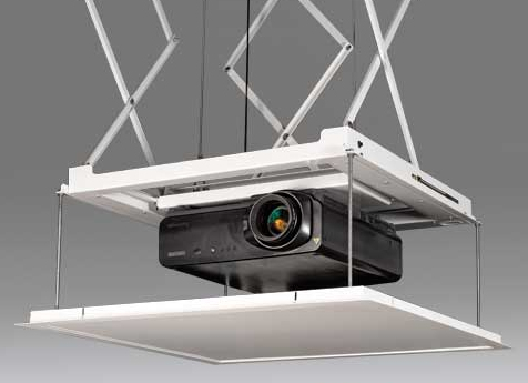 CE approved. Draper's Scissor Lift not only conceals your projector above the ceiling and sets it exactly where you need it for a presentation, it also brings it down to within easy reach for service. This projector lift offers three positions: store, show and service. The Scissor Lift stabilizes projector both laterally and front—to—back with 3 sets of scissors.