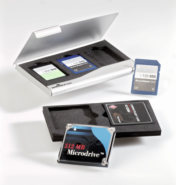 Aluminium memory card box suitable for SD, Multimedia and compact flash cards or for micro drives. With two interchangeable foam compartments suitable for safekeeping 3 Digital (SD)/MultiMedia (MM) cards (24x32x2 mm) or 2 Compact Flash (CF) cards/micro-drives (36.5x43x3 mm).