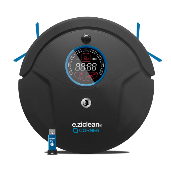 E.ziclean CORNER. Dust container type: Dust bag, Dust capacity (total): 0.8 L, Colour of product: Black. Noise level: 48 dB, Floor surfaces supported: Carpet, Linoleum, Tiles, Integrated sensors: Infrared sensor. Battery technology: Lithium-Ion (Li-Ion), Battery life: 2 h, Battery life: 120 m². Diameter: 35 cm, Height: 90 mm, Weight: 3.5 kg