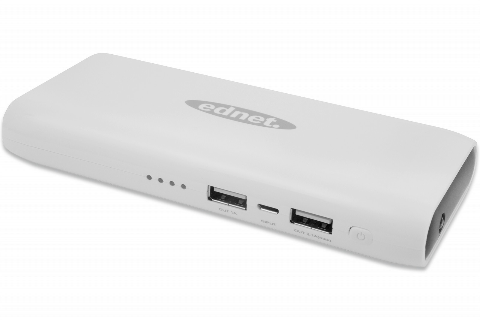 Even more performance for your mobile devices! Thanks to the new ednet Power Bank 10000, empty batteries belongs to the past. When your battery is empty the powerful rechargeable Li-Ion battery allows you to use your smartphone, tablet, MP3-player etc. quickly again. Trough the 2 USB ports (1x 2.1A, 1x 1A) the power bank is ideal for loading your smartphone and your tablet at the same time. The LED indicator shows the remaining battery capacity of the power bank. The power bank will be charged via the included USB cable (Micro USB B to USB A) with your PC, notebook or alternatively via a USB socket adapter (31803). As an additional feature the power bank also has an integrated LED flashlight.