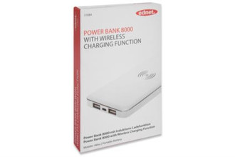Even more performance for your mobile devices! Thanks to the new ednet Power Bank 8000 with wireless charging function, empty batteries belongs to the past. When your battery is empty the powerful rechargeable Li-Polymere battery allows you to use your smartphone, tablet, MP3 player etc. quickly again. Trough the 2 USB ports (1x 2.1A, 1x 1A) the power bank is ideal for charging your smartphone and your tablet at the same time. The power bank will be charged via the included USB cable (Micro USB to USB A) with your PC, notebook or alternatively via a USB socket adapter (31803). As an additional feature the power bank also has a wireless (induction) charging function. Charge comfortable, completely without a cable, another additional mobile device. To do this, place e.g. your smartphone on the top, in the marked induction charging area. Some smartphones have this technology already on-board. Otherwise you need to use this function, a receiver pad for your device, which is placed behind the battery cover. In addition, almost all smartphone manufactures provide suitable batteries in which the fuction is already integrated.