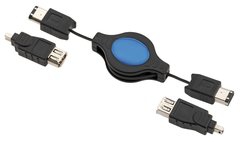 This FireWire (IEEE 1394) Retractable Travel Kit contains two FireWire (IEEE1394) adapters 6 Pin to 4 Pin you need for the connection of devices with 4 Pin FireWire port (e. g. Digital- or Video Camera) or with 6 Pin FireWire port (e. g. mobile hard disk or external drive) to your Notebook/PC with 4 Pin or 6 Pin FireWire port by using the retractable FireWire (IEEE1394) cable 6 to 6 Pin (transfer rate: 400 Mbit/s). Incl. practical travel bag.