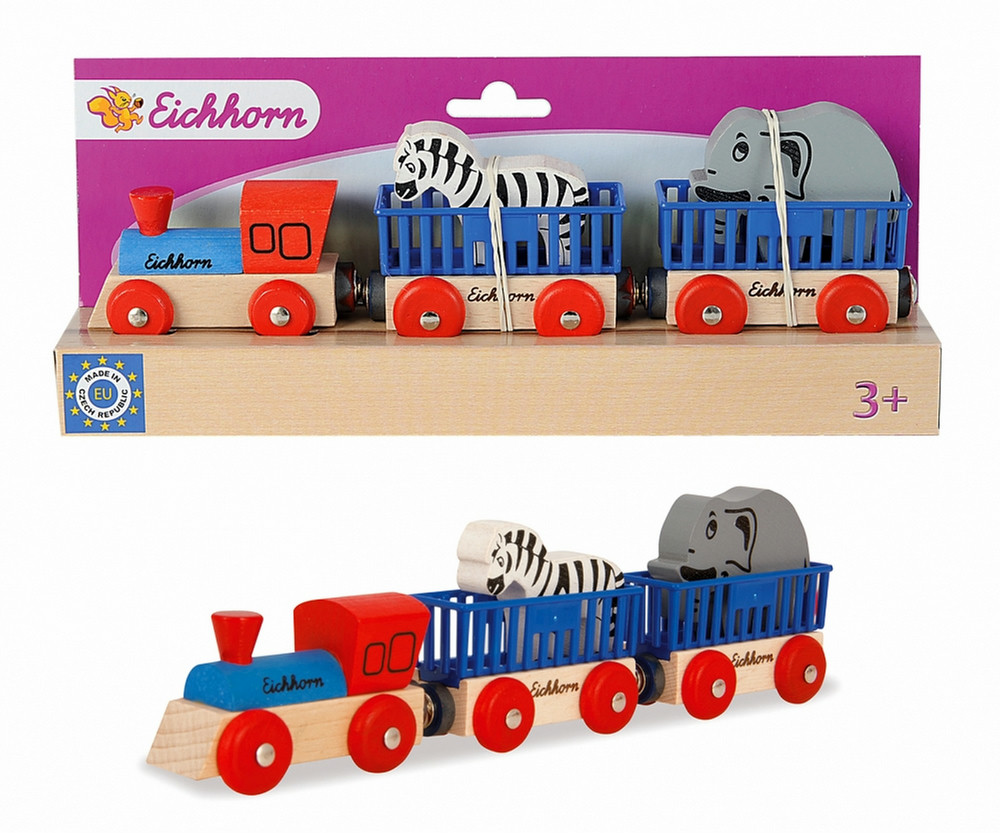 Caution, animal transport! A zebra and an elephant are transported on these carriages. The carriages are linked together with magnets. The Eichhorn train can be combined with almost all railway systems.