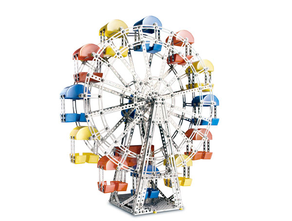 That wiht a height of 60 cm large ferris wheel can be build with over 1200 parts. The gear motor (i= 1:84) and an battery box (stepwise shiftable) are included in this kit. Necessary are only 3 batteries type C (R14).