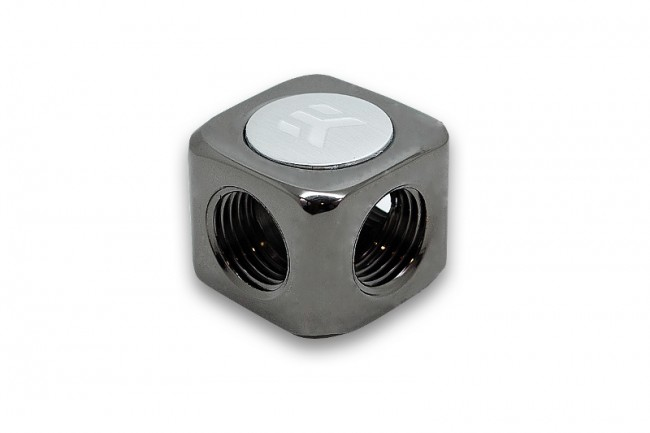 EK-AF T-Splitter 3F G1/4 - Black Nickel EK-AF T-Splitter is a simple cube-shaped adapter fitting with 3 (three) G1/4" BSP Female threads. This product is useful for splitting or combining the liquid flow in your loop.