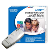 Are you often on the road with your notebook? Then the nSPOT is ideal if you like to use the Internet. Wireless networks are available all around, although you never know exactly where. Every time you wish to connect to a wireless network you have to start your notebook to find out where the nearest wireless network is. With the Eminent nSPOT this problem is remedied. The nSPOT detects wireless networks immediately and shows whether or not a network is secured. When a not secured wireless network is detected, you simply plug the nSPOT in the USB port on your computer and there you go: a stable network connection! So the nSPOT is indeed a multifunctional device. But this is not all: the nSPOT can also be used as an access point. Now you can use your own laptop as an access point for other users. Ideal when you do not have an access point at home but you do want to have your friends surf the Internet with their own notebooks. In other words, the nSPOT is an absolute must for every mobile computer enthusiast!