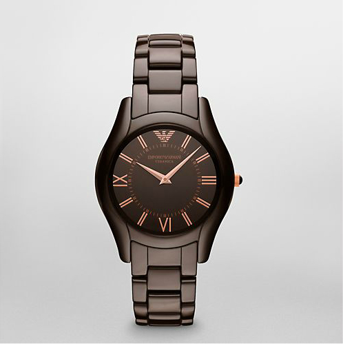 This brown ceramic watch features a lacquer brown dial with rose gold-tone accents.