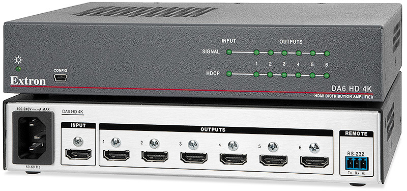 The Extron DA HD 4K Series includes one input, multiple output distribution amplifiers for HDMI signals at resolutions up to 4K. They support data rates up to 10.2 Gbps, 3D, Lip Sync, and HD lossless audio formats, along with integrator-friendly features such as automatic input cable equalization, automatic color bit depth management, and selectable output muting. They also feature Extron EDID Minder® and Key Minder® technologies to maintain continuous EDID communication between connected devices and ensure simultaneous distribution of HDCP-encrypted source content. The DA HD 4K distribution amplifiers are available in sizes from two to six outputs, and are ideal for applications that require reliable distribution of a single HDMI source signal to multiple displays.