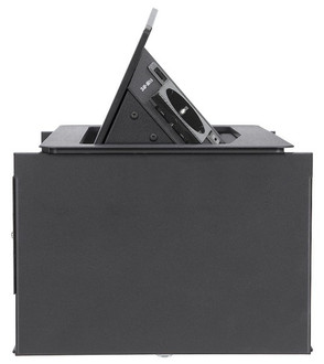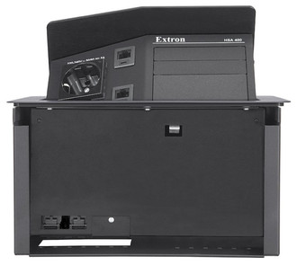 The Extron Hideaway® HSA 400 is a tilt-up, architectural solution for inconspicuous computer-video interface connector access and control. The Hideaway HSA 400 enclosure is designed for easy mounting into tables, desks, or other AV furniture. The durable and reliable enclosure is very compact, which keeps installation time and effort at a minimum. Once installed, the HSA 400 fits nearly flush with the tabletop, storing the connectors out of sight. To access the connectors, users press down on the top of the enclosure. Pressing down releases a mechanical latch and the Hideaway HSA 400 slowly pivots into view, presenting the connectors at an ergonomic 49-degree angle to the tabletop.
