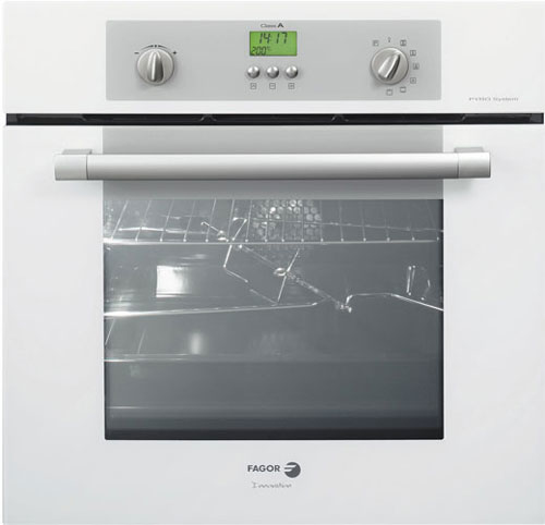 Fagor 5H-745B. Oven type: Electric oven, Total oven(s) interior capacity: 53 L, Total oven power: 2100 W. Colour of product: White, Control type: Buttons, Rotary, Cord length: 1.3 m. Energy efficiency class: A, AC input voltage: 220-240 V, AC input frequency: 50 Hz. Width: 592 mm, Depth: 609 mm, Height: 592 mm. Installation compartment dimensions (WxDxH): 560 x 550 x 585 mm, Energy consumption: 3.385 kWh