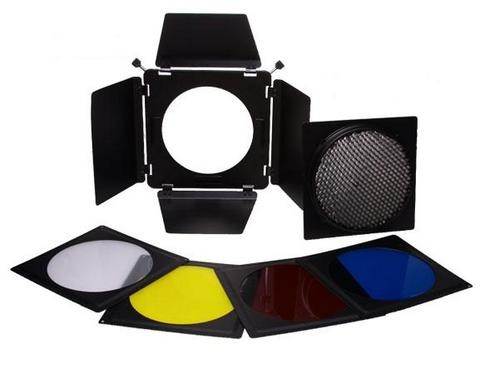 The four-leaf barn door allows controlling the spread of light. Honeycomb can be slipped in the front of the barn door to create spot effect.