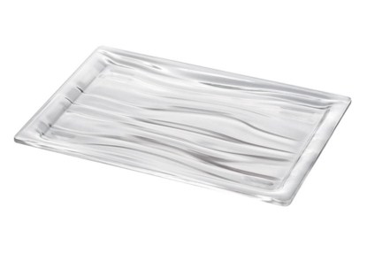 A transparent plastic rectangular tray, where the dynamics of the crystallised flowing water effect are made even more evident by the variable thicknesses of the material. The tray has 4 feet for greater stability; it also allows light to filter in from beneath, creating an evocative interplay between light and dark. The outer lip of the tray offers excellent grip. Made in Italy.