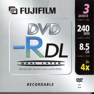 The new DVD-R DL (Double Layer) from FUJIFILM offers a capacity of 8.5 GB for data storage or 4 hours video recording in DVD quality respectively 16 hours in VHS quality on one disc. This is achieved by 2 separate recording layers on one single side of the DVD-R DL.