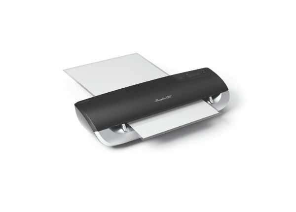 - Laminating speed of 19” per minute; laminates documents up to 12” wide