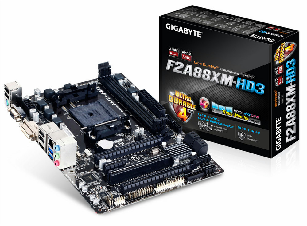 GA-F2A88XM-HD3 - FM2+, AMD A88X, 2 x 1.5V DDR3 DIMM, AMD Radeon HD 8000/7000, 1 x PCI Express 3.0 x16, 8 x SATA 6Gb/s, GbE LAN, UEFI DualBIOS, Micro ATX