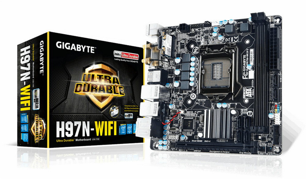 Intel H97 Express, LGA1150, 4 x DDR3 DIMM, PCI Express x16,mini-PCI, PS/2, 2 x HDMI, 2 x SMA, DVI-I, 4 x USB 3.0, 2 x USB 2.0, 2 x RJ-45, 5 x audio jacks, Mini-ITX, Wi-Fi, Bluetooth 4.0, 3.0+HS, 2.1+EDR