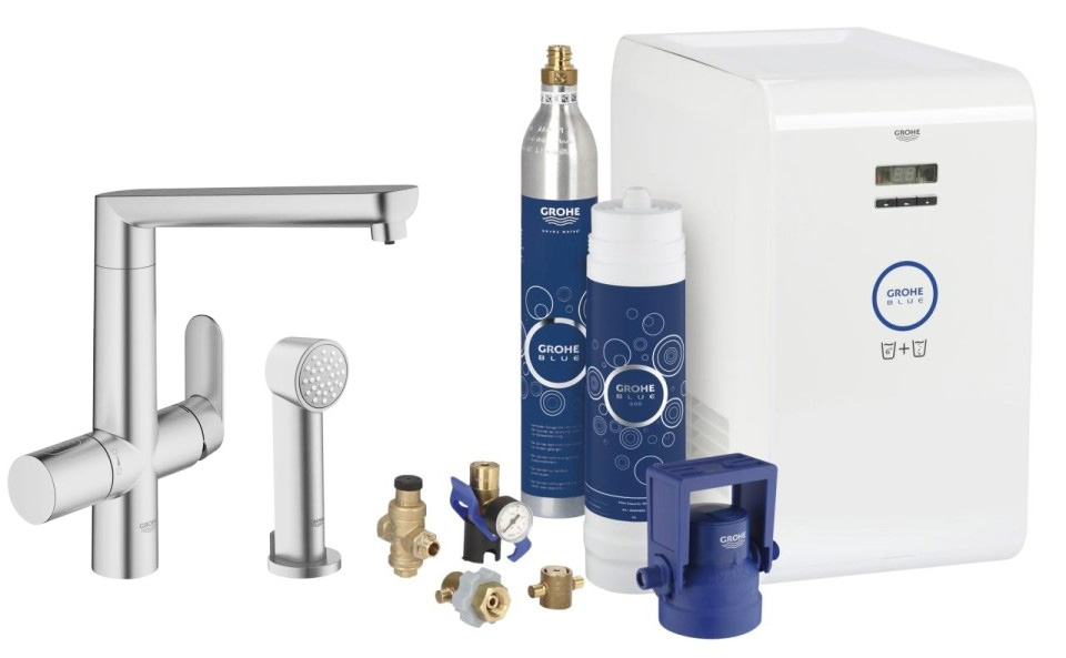 - GROHE Blue K7 single-lever sink mixer with filter function and SpeedClean side spray;