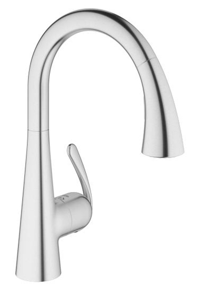 Modern design, maximum functionality! The GROHE Zedra comfort kitchen tap pleases the eye and at the same time lacks nothing in terms of convenience: design features like its fluid forms, lever shape and funnel-shaped spout lend a very elegant look to this tap. With well-thought-out features like its high swivel spout, the easy installation system and the pull-down comfort spray head, it is a popular helper in the kitchen. The tap is made of non-rusting, scratch resistant stainless steel, which is particularly hygienic and at the same time easy to clean thanks to its smooth surface. An attractive, smart and top quality product for your kitchen, through and through!