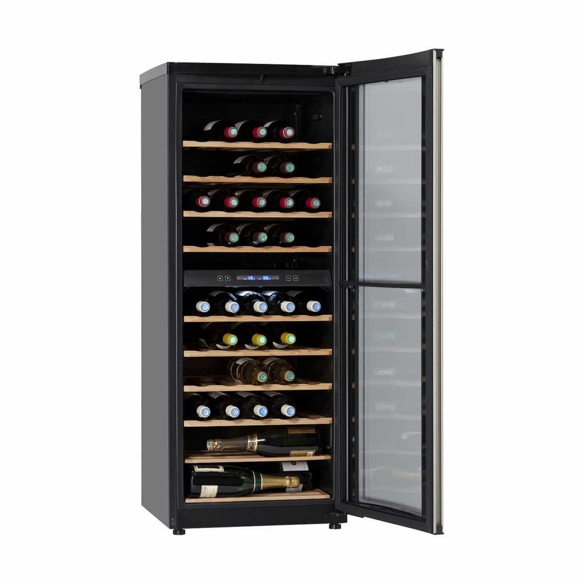Haier JC-160GDD. Case design: Freestanding, Number of shelves: 9 shelves, Colour of product: Black. Bottles capacity: 49 bottle(s), Noise level: 42 dB. Energy efficiency class: C, Annual energy consumption: 219 kWh, AC input voltage: 220-240 V. Width: 506 mm, Depth: 580 mm, Height: 1280 mm