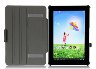 Our Hannspree Faux Leather case is our high end range and protects the device from scratches, bumps and any dirt or smudges. It also features a stand function that can be angled in three positions for watching films or typing. It has very hard corners for ultimate protection and cut outs are positioned to offer full functionality.
