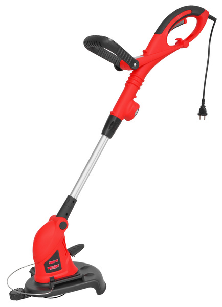 Electric powered grass trimer with telescopic handle and adjustable cutting head angle. Power input 500W and working width 30 cm.