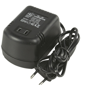 Compact converter to connect American 110 V equipment to European 230 V domestic power.