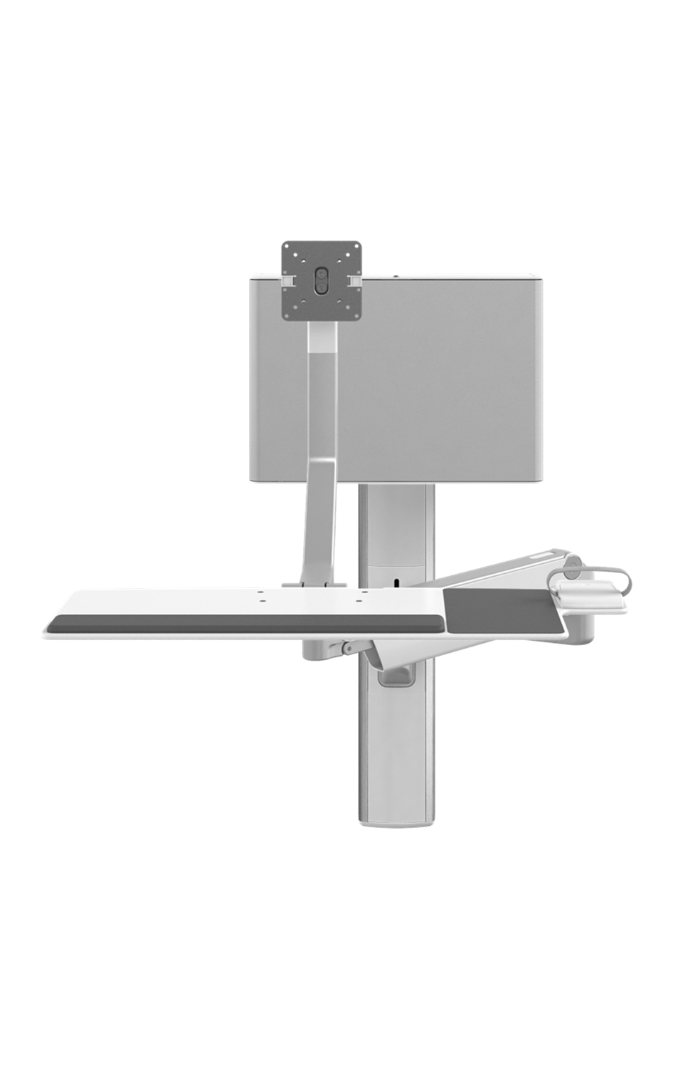 The V6 technology wall station combines exceptional space-savings with leading ergonomic design for comfortable caregiver computer use in any posture. The V6 supports a monitor and keyboard—along with hardware, shelves and accessories—within an ergonomic adjustment range for easy positioning to provide a healthy computing experience and encourage engagement with patients. Its sealed cable management system also promotes organization and mitigates infection-control concerns.