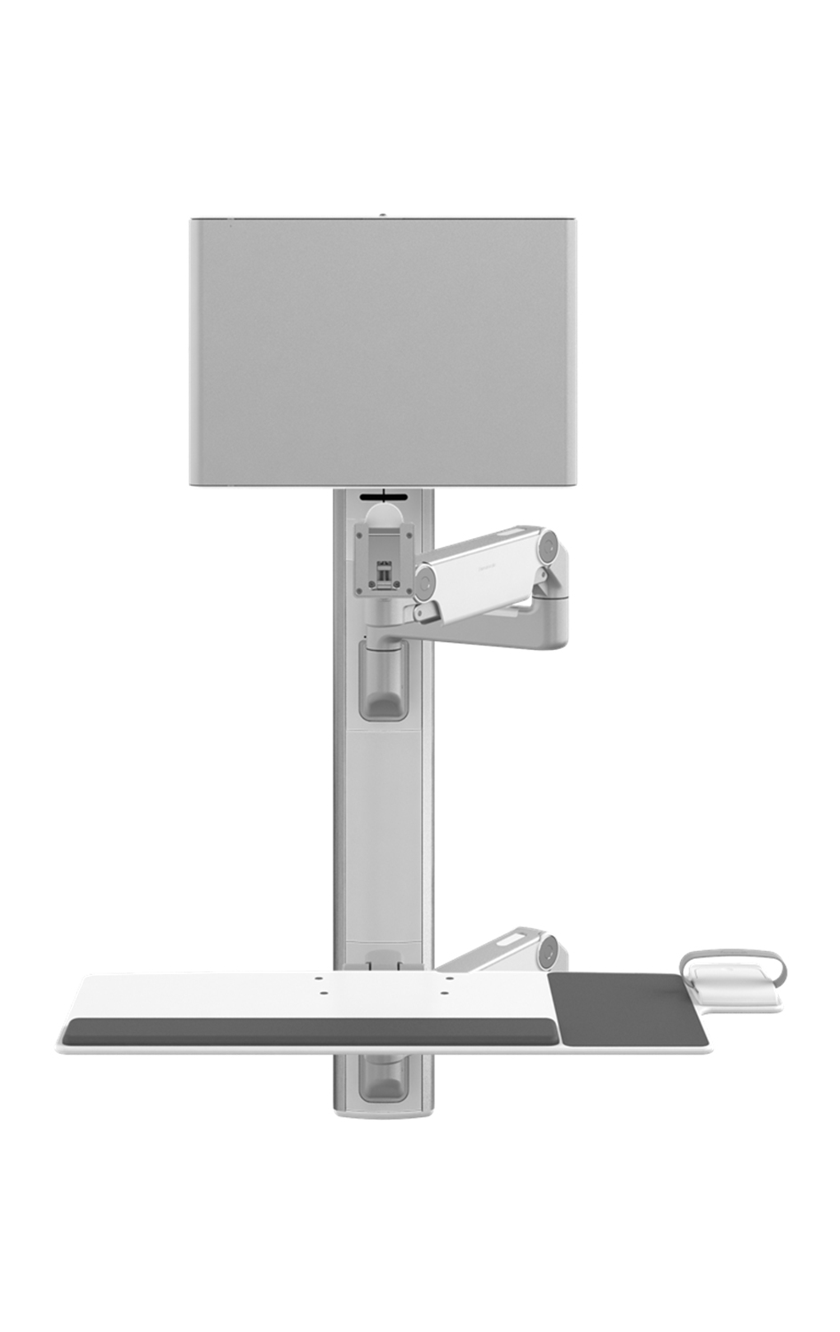 The V6 technology wall station combines exceptional space-savings with leading ergonomic design for comfortable caregiver computer use in any posture. The V6 supports a monitor and keyboard—along with hardware, shelves and accessories—within an ergonomic adjustment range for easy positioning to provide a healthy computing experience and encourage engagement with patients. Its sealed cable management system also promotes organization and mitigates infection-control concerns.