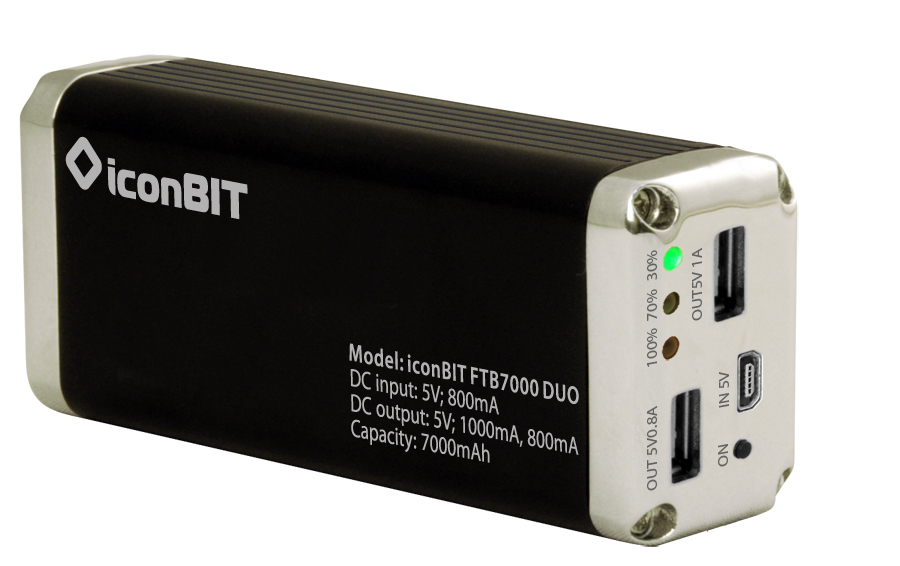 Compact portable power bank battery (7000 mAh, 5V/1A). Charges most mobile phones, GPS-navigators, portable gaming systems, many digital gadgets, iPad (1-2) and all generations of iPhone/iPod. Recharges from any USB-port in PC/laptop, media player or USB charger.