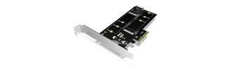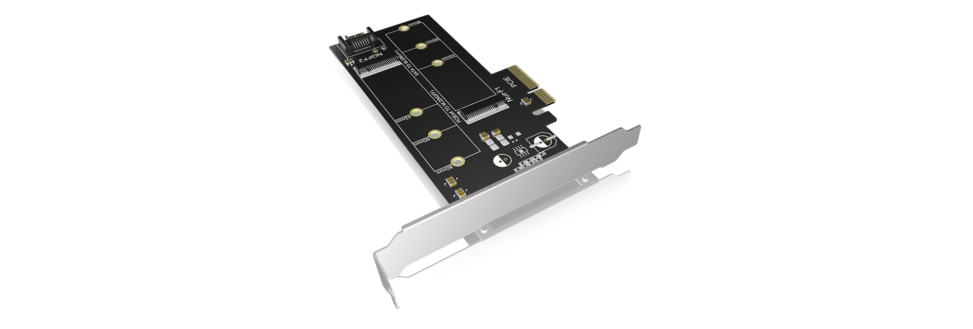 The IB-PCI209 is a 2x M.2 to PCIe 3.0 x4 and SATA III converter card. This PCI Bracket can hold two M.2 cards and converts one to PCIe and the other one to SATA III.