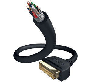 Fully-wired scart cable with gold-plated contacts and singlescreened leads. Flexible applications with straight cable leads.