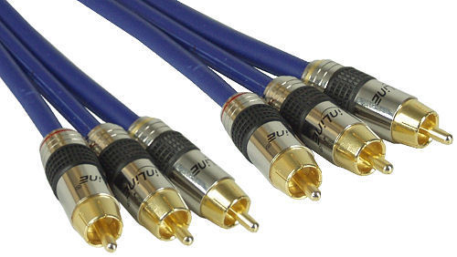 -six gold plated RCA plug, colour coded. -2 wires for audio. -1 wire for video (75 ohm). -Cable print: blue. -3x (2x) shielded coaxial line. -Alu-meyer / braid-shielded.