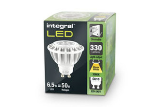 This premium 6.5W retro-fit Integral LED GU10 delivers a dimmable, warm white light and brightness, similar to a 50W halogen bulb. It features quad high output CREE LEDs, an anti-glare refractor, all finished in a diecast aluminium, thermally efficient body. The ideal lamp for commercial and home use.