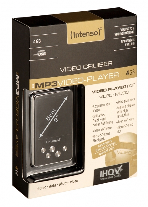 Intenso 4 GB / 2" Display Video Cruiser. Colour of product: Black. Player media type: Flash-media, Total storage capacity: 4 GB. Display diagonal: 5.08 cm (2"). Audio formats supported: MP3, WMA. Compatible operating systems: Windows Mac Linux