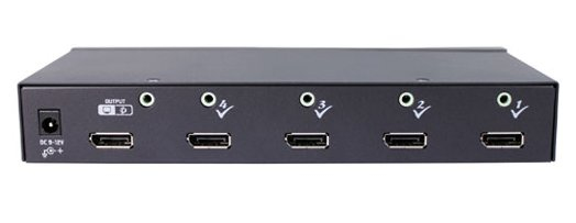 This DisplayPort and Audio selector is suitable for selecting 1 DisplayPort signal from 4 various DisplayPort and audio sources. Switching between the sources is possible via the front panel buttons. Support for IR remote control and serial control. The product is rack mountable.
