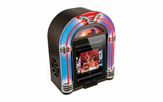 The Jukebox Dock features built-in stereo speakers and a universal dock for iPad, iPhone or iPod. Whether your playing classic rock or today's top ten, the Jukebox Dock is ready to fill any room with your favorite music. Just place your iPad into the Jukebox Dock's cradle, load your favorite jukebox app and you're ready to go. The Jukebox Dock will even charge your iPad while you listen. The Jukebox Dock has an eye-catching, real wooden cabinet with lighted neon-style trim. It's a great addition to any decor and will get everyone talking.