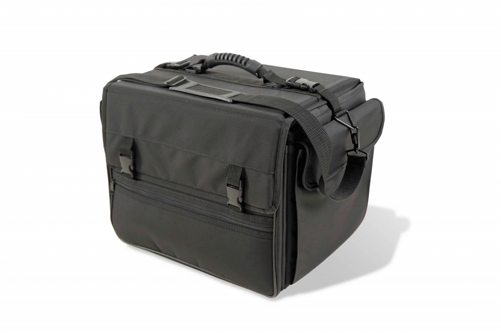 Carry multiple 15"-16" laptops (up to 5) or remove the dividers and carry a printer or Sheet feed scanner (such as HP ScanJet 7000 or HP LaserJet P1102W) with JELCO's JEL-1510CB lightweight ballistic nylon carry bag. This case is designed with padded removable dividers that can be positioned or removed to meet your varied needs. With the divider removed, the case can fit objects up to 15.5” x 10” x 11.5”. The case has separate side storage areas for accessories, laptop power packs, etc. Slide the JEL-1510CB onto the extended handle of your suitcase or other rolling bag using the piggyback strap on the back of the case.