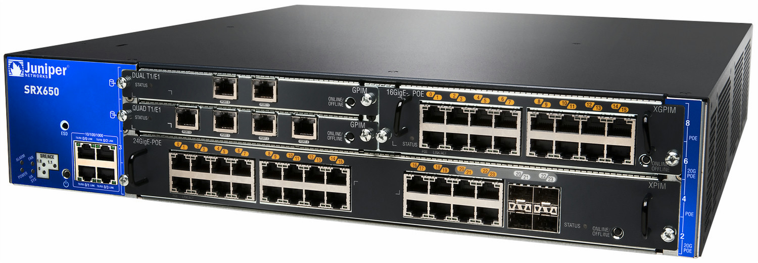 A Gigabit-Backplane Physical Interface Module (GPIM) is a network interface card (NIC) that installs in the front slots of the SRX550 or SRX650 Services Gateway to provide physical connections to a LAN or a WAN. The GPIM receives incoming packets from a network and transmits outgoing packets to a network. These modules will complement the onboard Ethernet interfaces to extend the types and port counts of network connections for the LAN or WAN.