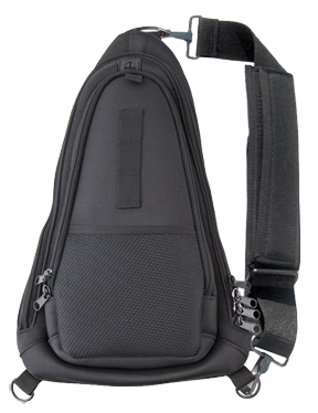 100% heavy duty polyester self defense bag is ambidextrous and features multiple straps for multiple carry options. Two double zippered pockets allow plenty of room for daily gear. One pocket is MOLLE holster compatible for pistol carry. Also includes MP3/cell phone pocket with feed through hole for headphones.