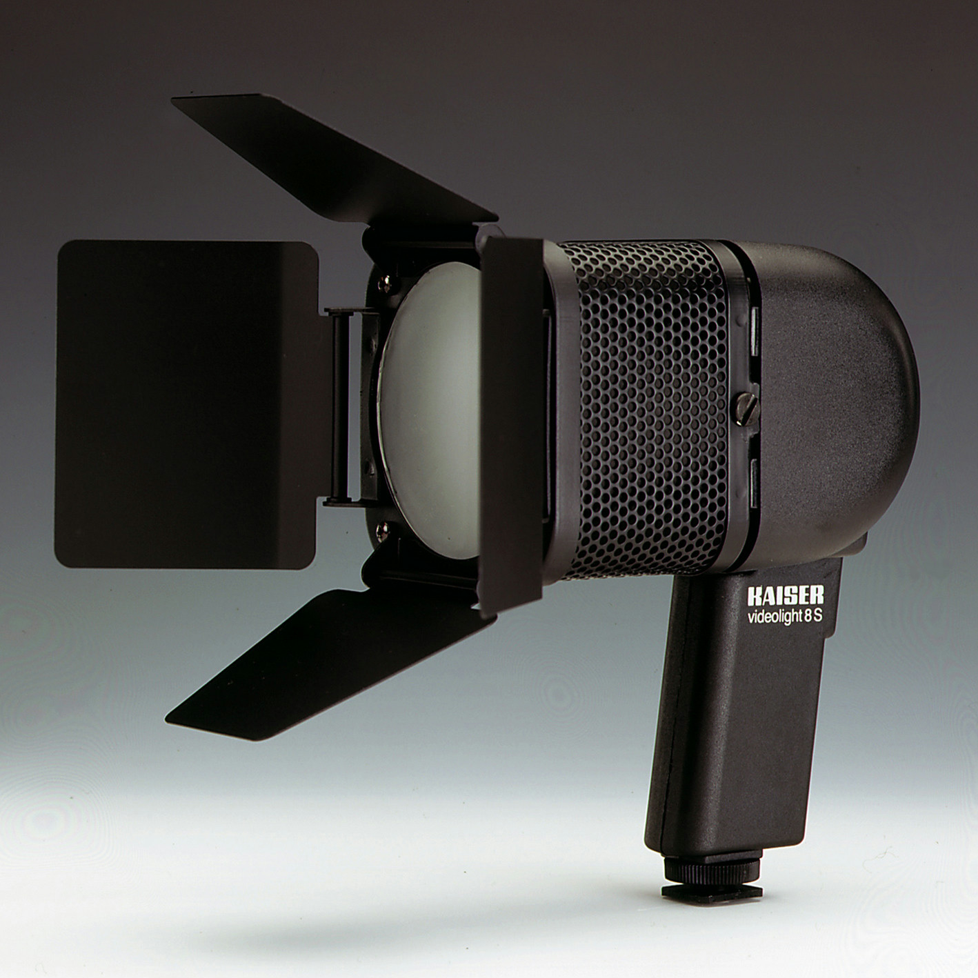 Halogen lighting unit for photo, filming and video shooting. Unlimited continuous operation without extra cooling. Front attachment with diffuser made of safety glass. Temperature-resistant reflector casing, for indirect lighting tilts upward by 90° with five click-stops. Slot shoe for mounting on camera. Thread 1/4“ for mounting on stand. On/off switch.