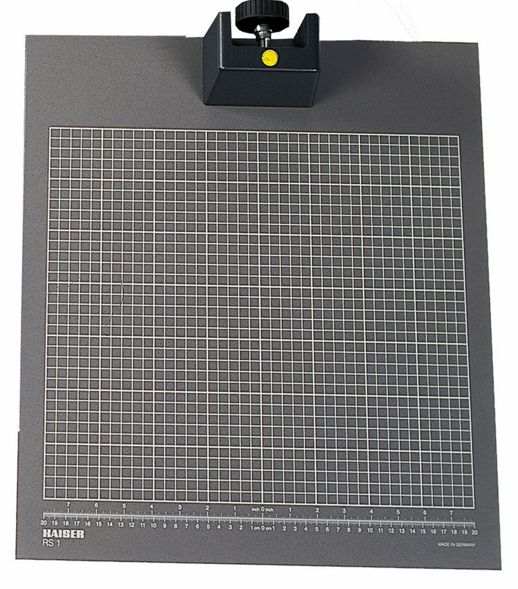 Matt grey laminated base board with mounted base for attaching column. Printed fine grid with cm and inch scale. Spirit level in base. Individually height-adjustable feet. 5518: approx. 600 x 500 x 32 mm (23.6 x 19.7 x 1.3 in.)