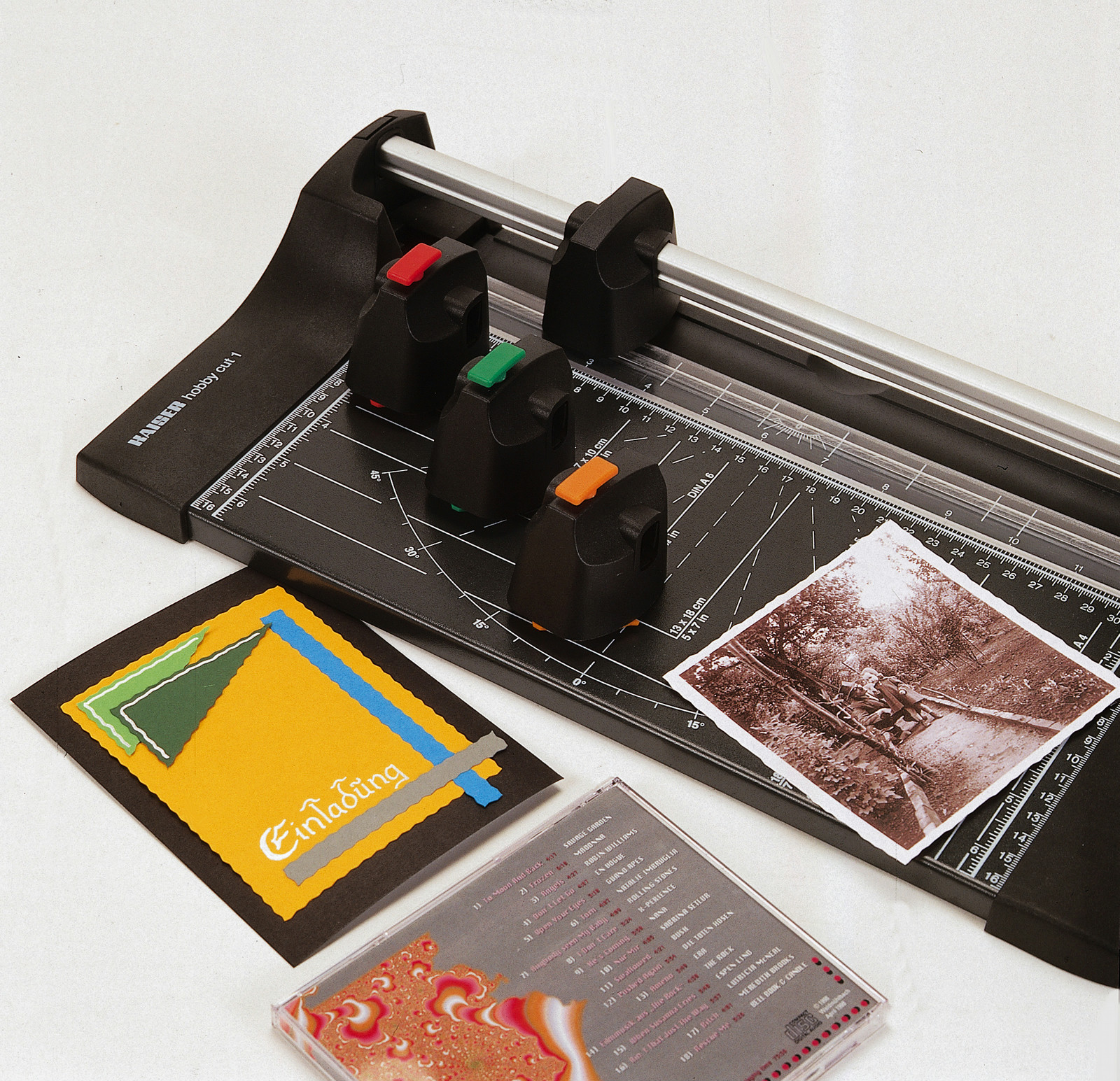 With self-sharpening rotating circular blade in a closed plastic housing. Automatic paper clamping for precision cutting. Transparent clamping bar. Two angle guides with cm/inch scale. Baseboard with cm/inch scale, angle and format markings.