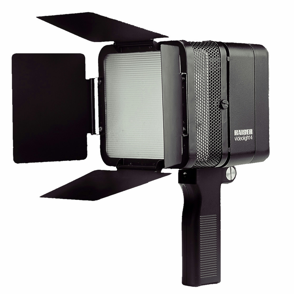 Halogen lighting unit for photo, filming and video shooting. Extremely quiet blower cooling for unlimited operation in every position. Four large light flaps for direct-aim lighting. Front attachment with diffusor screen of heat-resistant safety glass for extra-soft lighting. The upper part can be tilted steplessly for indirect lighting. The handle can be tilted through 180° and when mounted on a tripod assumes the function of a tilting head. For economical storing, the handle folds snugly onto the housing. Two stand threads 1/4“. The lamps can be switched on separately and have their own fuses. Additional switch for modelling light (2 x 500 W). Supplied complete with camera bracket and lamps.
