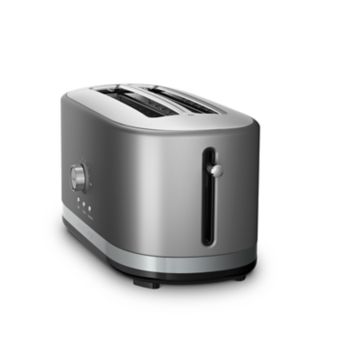 Make a statement on your counter with the newly designed KitchenAid® 4-Slice Toaster, which accommodates a variety of shapes and sizes of Artisan breads. This toaster features 7 shade settings, including Bagel, Defrost, Reheat and Keep Warm. A high lift lever is convenient for removing smaller slices of bread or to check toasting progress at any time.