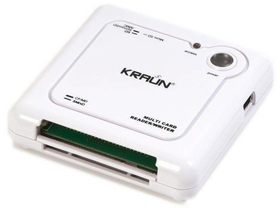Kraun KC.R1. Compatible memory cards: CF, Memory Stick (MS), MicroDrive, miniSD, MMC, SD, SmartMedia, xD. Interface type: USB 2.0. Colour of product: White. Package type: Box. Cables included: USB